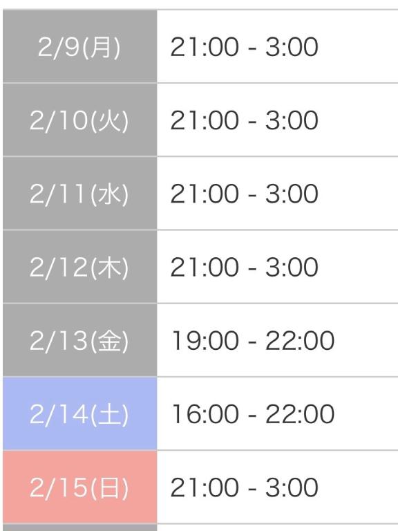 | 2月14日(土) | 次回出勤調整中💕 |